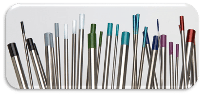 钨是一种熔点为3410°C的的难熔性金属。它能承受电弧的热量,即使变红了也能保持硬度。过去,钍钨电极广泛用于TIG焊接,但由于钍是 低放射性元素,需要特殊的磨削工具,以确保磨削颗粒的安全处置。今天,不同的合金钨电极成为首选,例如没有任何放射性的铈钨或镧钨,其性能也可与钍钨电极相媲美。这就产生了根据ISO标准26848(见下表)识别的颜色编码(显示在电极端部).