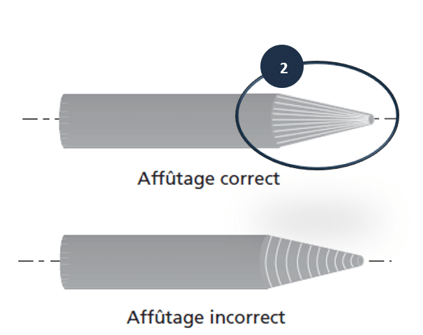 磨削机的设计必须确保锥形部分上的磨痕与电极的颗粒结构对齐:纵向。这能保证更好的起弧效果,改善电弧稳定性。