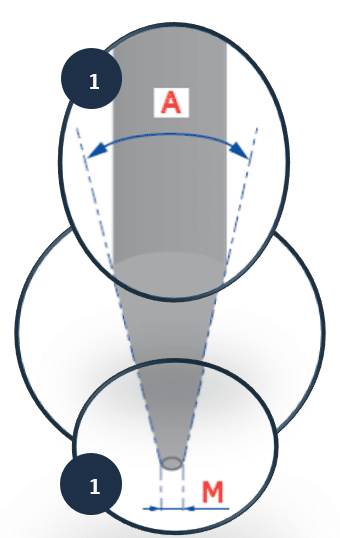 为了保持恒定和紧凑的焊接电弧,用于机械化或自动化焊接的钨电极端部需要被磨削成锥形。电极直径、磨削角度A以及尖部 平端直径M取决于焊接电流强度。 研磨角度“A”应在18°~ 30°之间,磨平的尖端直径应在0.1 mm ~ 0.5 mm之间。焊接电流强度大则要求更大的磨削角度和更大的平端直径。