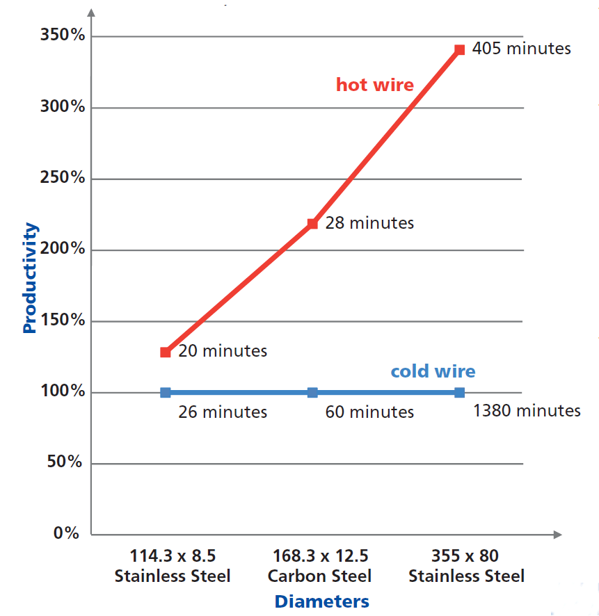 当采用窄间隙工艺时,生产率的提升是相当可观的,而且它与焊接管的厚度是成比例地增加:截面越厚,使用窄间隙热丝TIG焊接就越能获利。试验表明,窄间隙坡口与常规坡口相比,生产率的提高始于某一个厚度点,在这个厚度点上必须开始使用每层多道焊。壁厚在55至60mm时,获利系数是传统焊接的3倍,壁厚超过60mm时,获利系数是传统焊接的5倍。