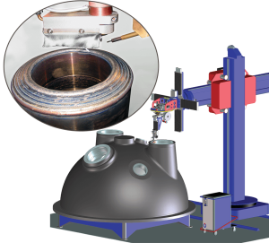 长至12米的钢管可以水平定位,并围绕其纵轴旋转。两个带有送丝装置的焊炬安装在焊枪端部,由钢丝绳引导进入管子内壁。焊接程序始于第一个焊炬起弧,堆焊焊枪抬起,变位机同步旋转管件,第一层耐腐蚀合金堆焊在管子内部进行。第二个焊炬,安装于焊枪更远处,抵达第一层熔敷层后开始堆焊第二层。