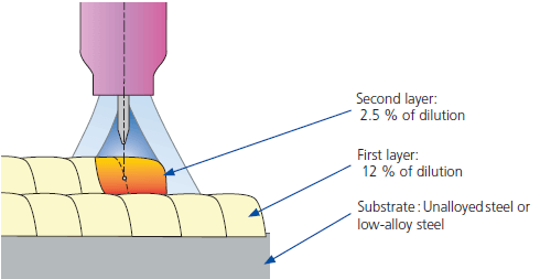 在熔化最少量的母材与确保母材与熔敷层结合质量之间寻找折衷方案,这仍然是工艺的主要难点,需要在熔敷层的致密性和化学成分之间取得平衡。稀释率反映了由于与熔融母材或已有堆焊层混合而形成的合金层的化学成分变化。