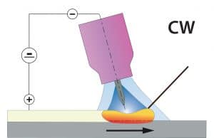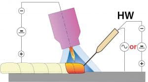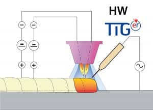 在非消耗性钨电极和工件之间形成并维持电弧。电极支撑着电弧的热量,工件金属熔化并形成焊接熔池。必须防止工件的熔融金属和电极被大气中的氧气氧化,惰性气体如氩气可作为保护气体。如果需要添加填充金属,则可以将焊丝送入熔池,借由电弧传递过来的能量焊丝得以在熔池熔化。