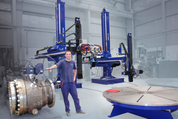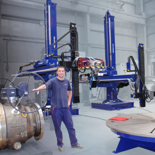 为垂直位置(2G)而设计的解决方案通常是用来堆焊圆柱形部件。大多数情况下工件由转台或变位机定位,可是还有一些更复杂的情况,工件因为尺寸和重量,或者因为形状而无法运动,例如偏心钻孔或喷嘴。针对这些应用,POLYSOUDE设计出了一系列的无限回转焊接和堆焊机头,焊枪可在不缠绕水气线束的情况下旋转。这些设备可用于固定工件的高自动化的堆焊操作。